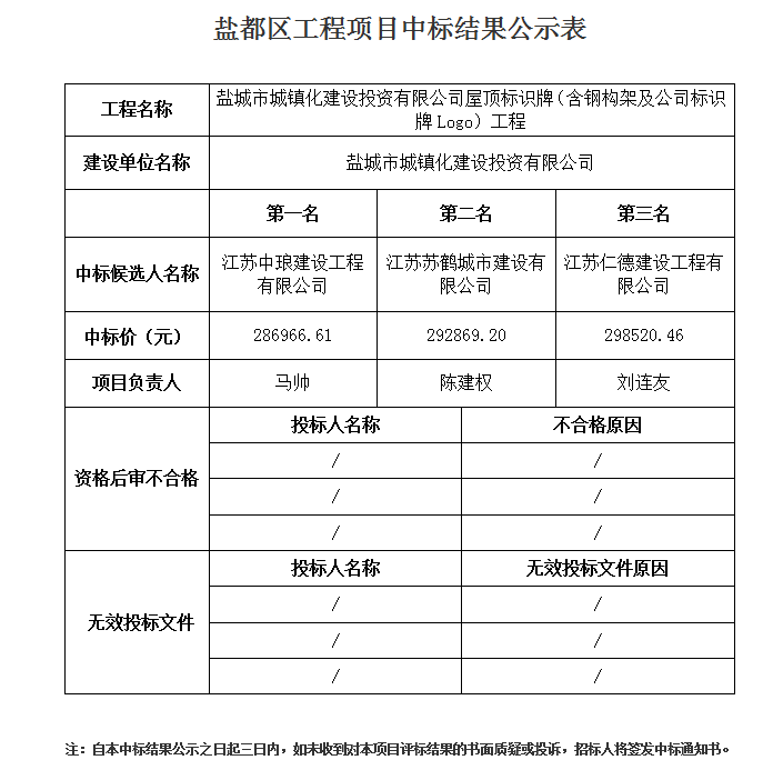 鹽城市城鎮(zhèn)化建設(shè)投資有限公司屋頂標(biāo)識(shí)牌(含鋼構(gòu)架及公司標(biāo)識(shí)牌Logo)工程中標(biāo)公示