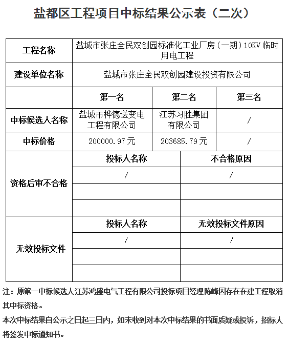 鹽城市張莊全民雙創(chuàng)園標準化工業(yè)廠房(一期)10KV臨時用電工程中標公示
